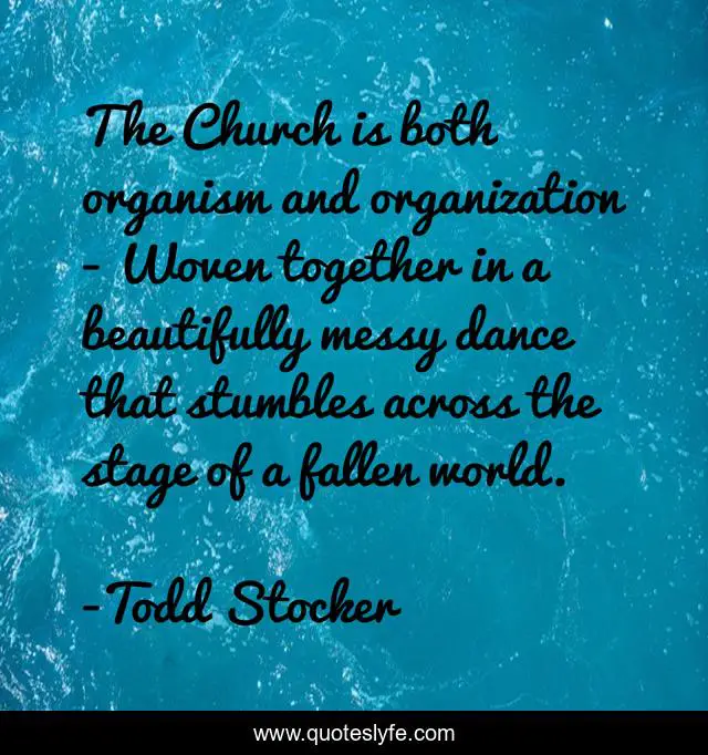 This page presents the quote "The Church is both organism and organization - Woven together in a beautifully messy dance that stumbles across the stage of a fallen world.". Author of this quote is Todd Stocker. This quote is about confidence, organization, dance, positive, motivational, optimistic, inspirational, church, world,.