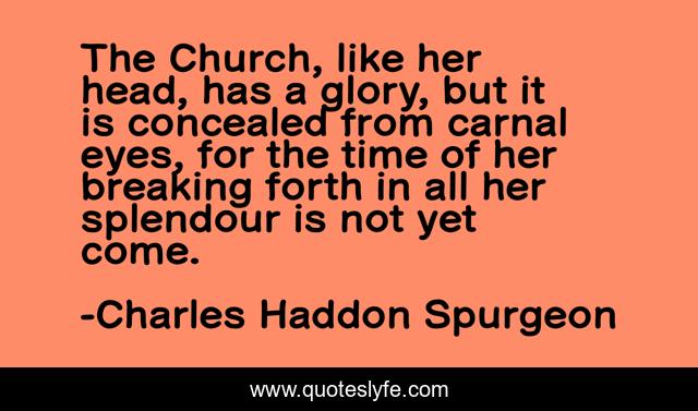 This page presents the quote "The Church, like her head, has a glory, but it is concealed from carnal eyes, for the time of her breaking forth in all her splendour is not yet come.". Author of this quote is Charles Haddon Spurgeon. This quote is about discipleship, glorification, sanctification,.