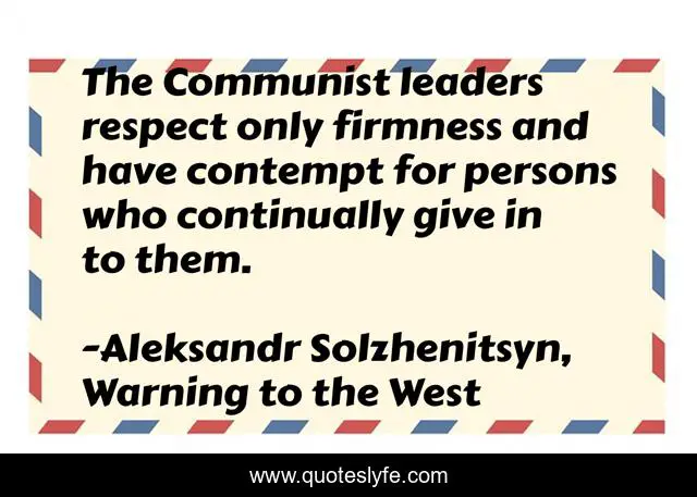 This page presents the quote "The Communist leaders respect only firmness and have contempt for persons who continually give in to them.". Author of this quote is Aleksandr Solzhenitsyn, Warning to the West. This quote is about communism, diplomacy,.