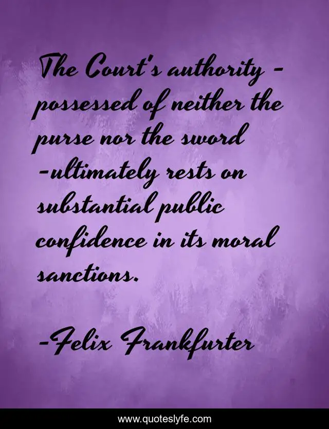 This page presents the quote "The Court's authority - possessed of neither the purse nor the sword -ultimately rests on substantial public confidence in its moral sanctions.". Author of this quote is Felix Frankfurter. .