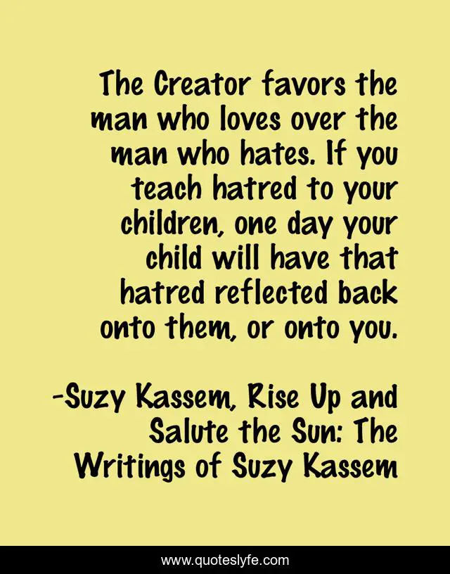 This page presents the quote "The Creator favors the man who loves over the man who hates. If you teach hatred to your children, one day your child will have that hatred reflected back onto them, or onto you.". Author of this quote is Suzy Kassem, Rise Up and Salute the Sun: The Writings of Suzy Kassem. This quote is about training, kids, love, knowledge, educating, parethood, father, youth, parenting,.