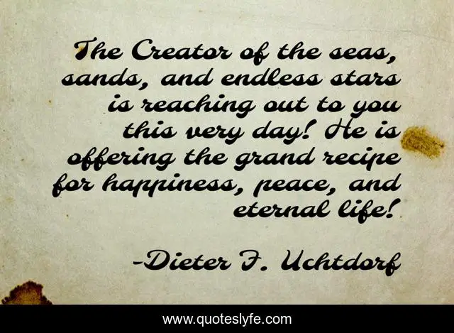 This page presents the quote "The Creator of the seas, sands, and endless stars is reaching out to you this very day! He is offering the grand recipe for happiness, peace, and eternal life!". Author of this quote is Dieter F. Uchtdorf. This quote is about life, peace, stars,.