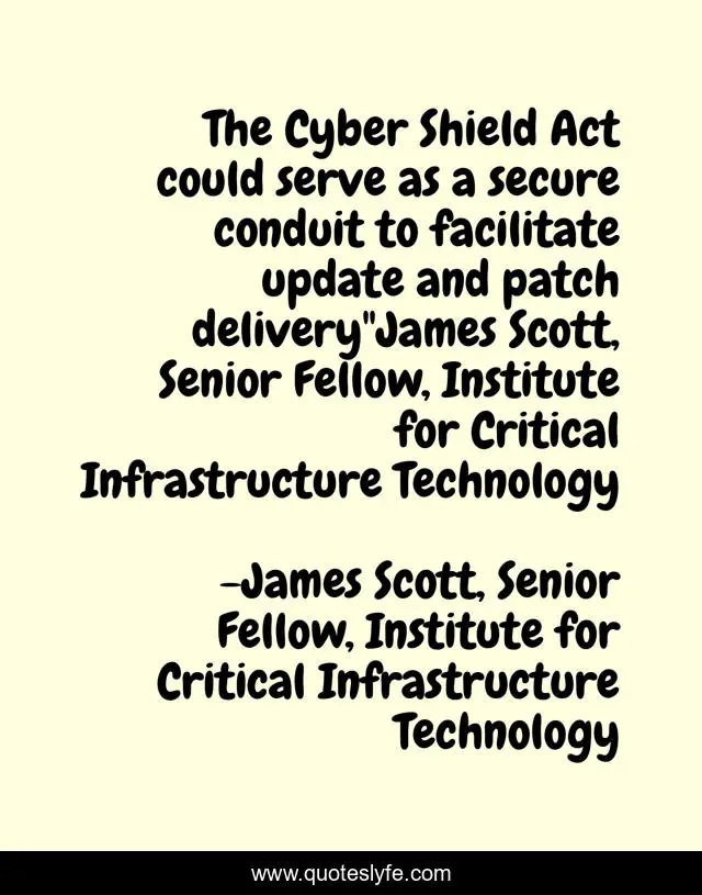 This page presents the quote "The Cyber Shield Act could serve as a secure conduit to facilitate update and patch delivery"James Scott, Senior Fellow, Institute for Critical Infrastructure Technology". Author of this quote is James Scott, Senior Fellow, Institute for Critical Infrastructure Technology. This quote is about congress, critical-infrastructure, capitolhill, cyber-shield-act, icit, james-scott, security, legislative-community,.