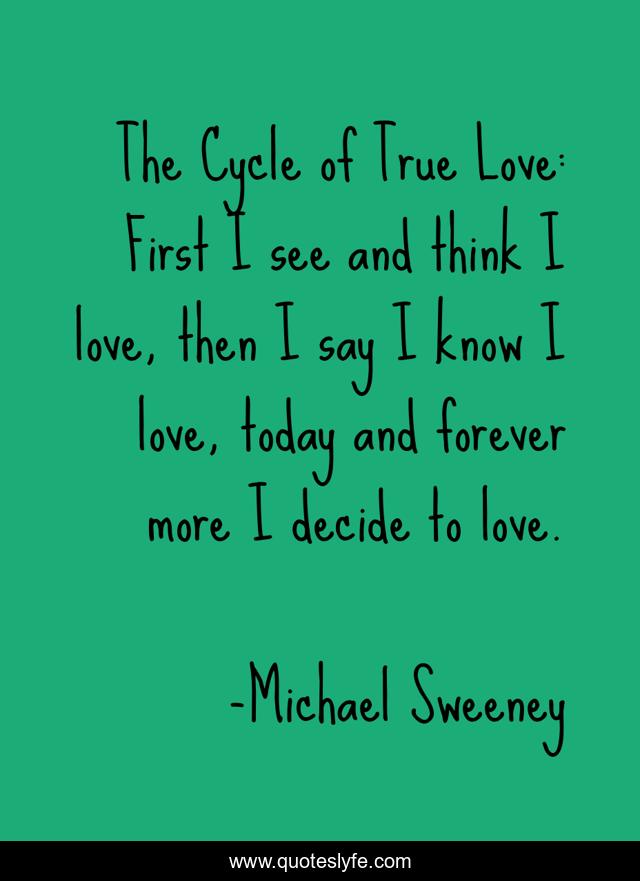 This page presents the quote "The Cycle of True Love: First I see and think I love, then I say I know I love, today and forever more I decide to love.". Author of this quote is Michael Sweeney. This quote is about romance, true-love, lovers, forever-love, true-love-cycle,.