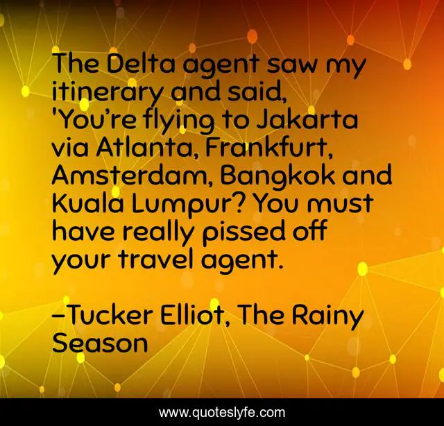 This page presents the quote "The Delta agent saw my itinerary and said, 'You’re flying to Jakarta via Atlanta, Frankfurt, Amsterdam, Bangkok and Kuala Lumpur? You must have really pissed off your travel agent.". Author of this quote is Tucker Elliot, The Rainy Season. This quote is about jakarta, travel, indonesia, vietnam,.