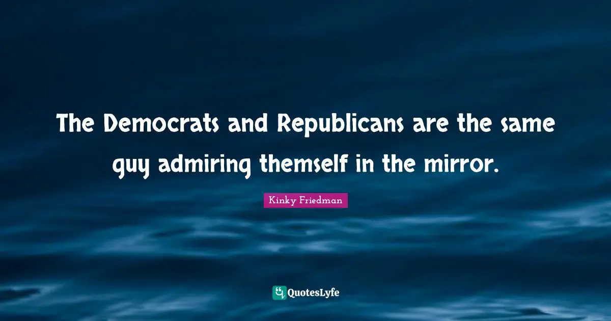 This page presents the quote "The Democrats and Republicans are the same guy admiring themself in the mirror.". Author of this quote is Kinky Friedman. This quote is about republican, admiring, mirrors, guy,.