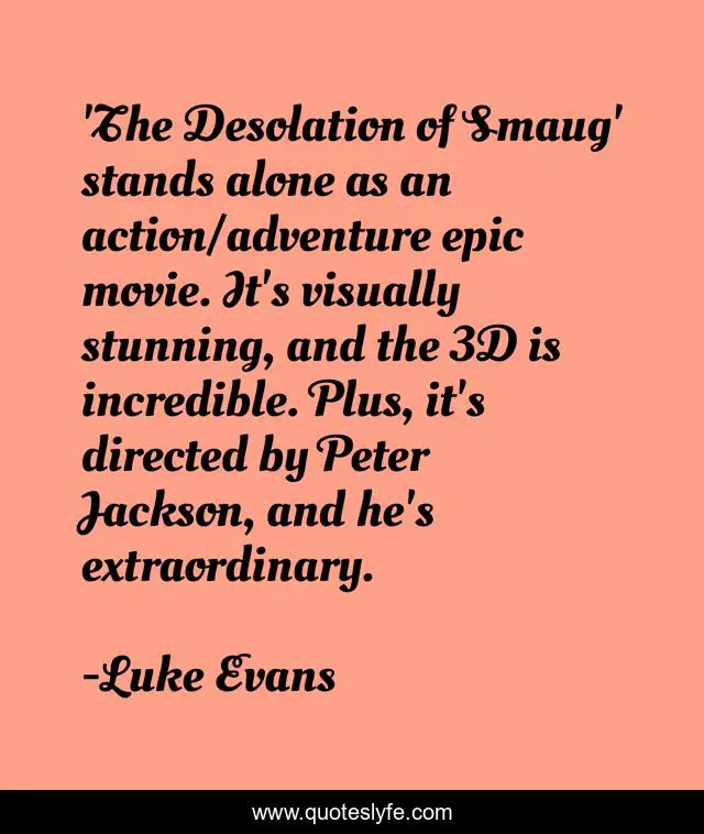This page presents the quote "'The Desolation of Smaug' stands alone as an action/adventure epic movie. It's visually stunning, and the 3D is incredible. Plus, it's directed by Peter Jackson, and he's extraordinary.". Author of this quote is Luke Evans. This quote is about extraordinary, stunning,.