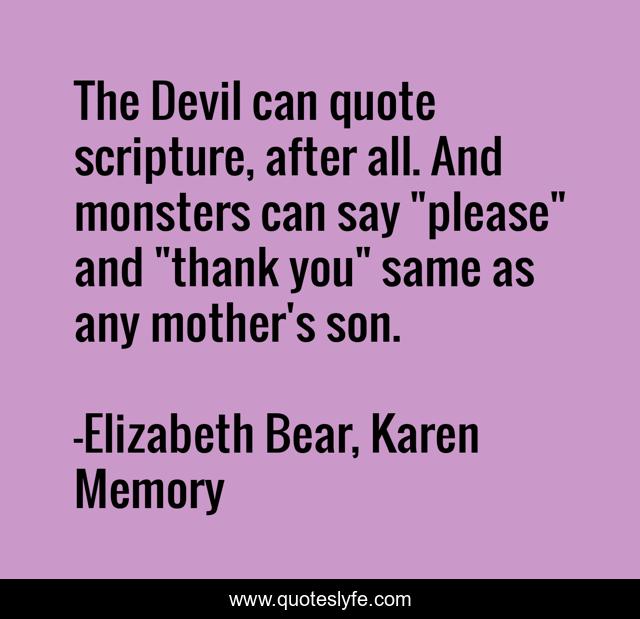 This page presents the quote "The Devil can quote scripture, after all. And monsters can say "please" and "thank you" same as any mother's son.". Author of this quote is Elizabeth Bear, Karen Memory. This quote is about the-devil, evil,.