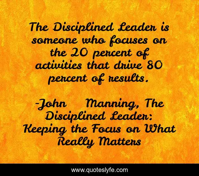 This page presents the quote "The Disciplined Leader is someone who focuses on the 20 percent of activities that drive 80 percent of results.". Author of this quote is John Manning, The Disciplined Leader: Keeping the Focus on What Really Matters. This quote is about discipline, activities, leadership, focus, results,.