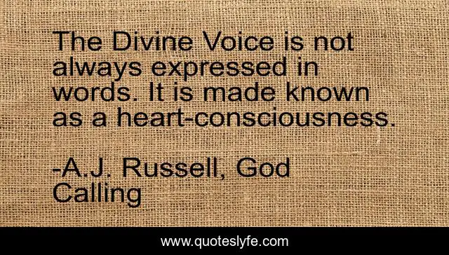 This page presents the quote "The Divine Voice is not always expressed in words. It is made known as a heart-consciousness.". Author of this quote is A.J. Russell, God Calling. This quote is about god, religion,.