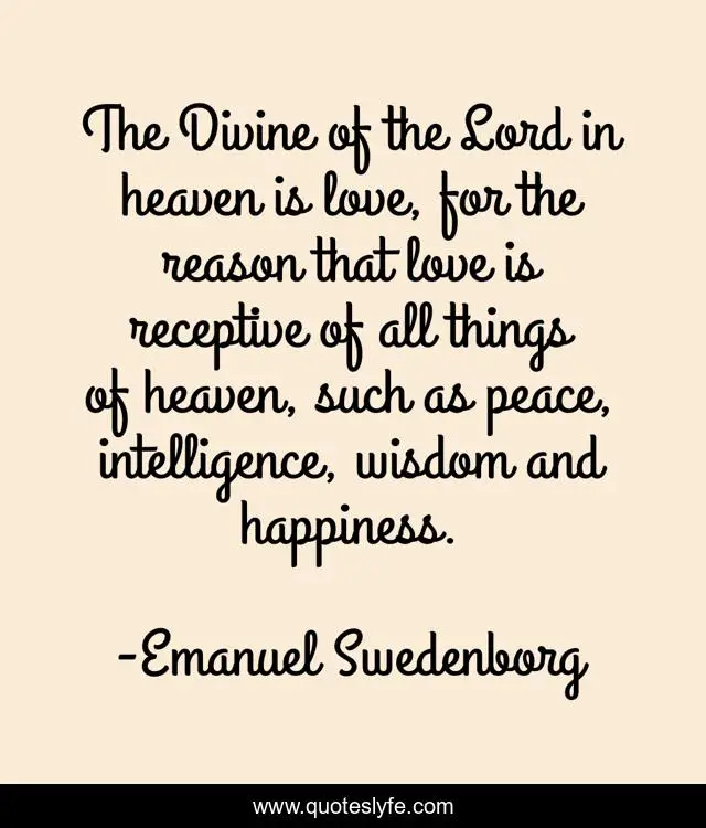 This page presents the quote "The Divine of the Lord in heaven is love, for the reason that love is receptive of all things of heaven, such as peace, intelligence, wisdom and happiness.". Author of this quote is Emanuel Swedenborg. This quote is about peace, love, affection, wisdom,.