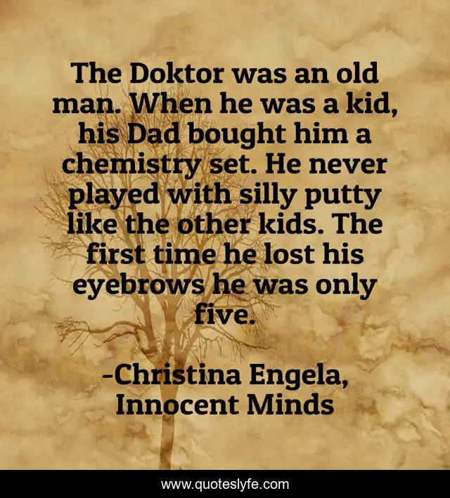 This page presents the quote "The Doktor was an old man. When he was a kid, his Dad bought him a chemistry set. He never played with silly putty like the other kids. The first time he lost his eyebrows he was only five.". Author of this quote is Christina Engela, Innocent Minds. This quote is about a, kids, set, five, kid, the, man, he,.