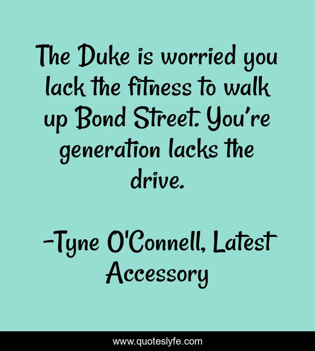 This page presents the quote "The Duke is worried you lack the fitness to walk up Bond Street. You’re generation lacks the drive.". Author of this quote is Tyne O'Connell, Latest Accessory. This quote is about fashion, london,.