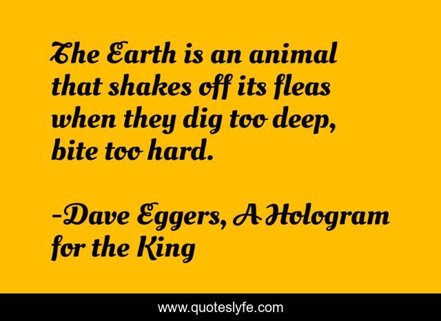 This page presents the quote "The Earth is an animal that shakes off its fleas when they dig too deep, bite too hard.". Author of this quote is Dave Eggers, A Hologram for the King. This quote is about mortality, nature,.