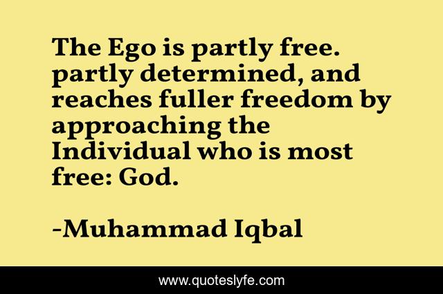 This page presents the quote "The Ego is partly free. partly determined, and reaches fuller freedom by approaching the Individual who is most free: God.". Author of this quote is Muhammad Iqbal. This quote is about god, ego, free,.