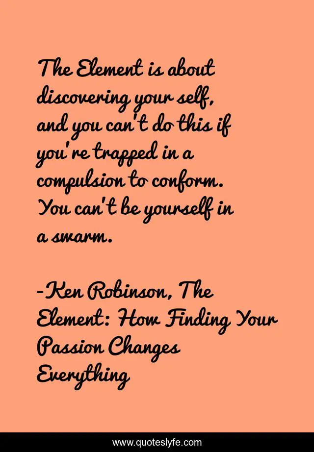 This page presents the quote "The Element is about discovering your self, and you can't do this if you're trapped in a compulsion to conform. You can't be yourself in a swarm.". Author of this quote is Ken Robinson, The Element: How Finding Your Passion Changes Everything. This quote is about dream, life, passion, psychology, success,.