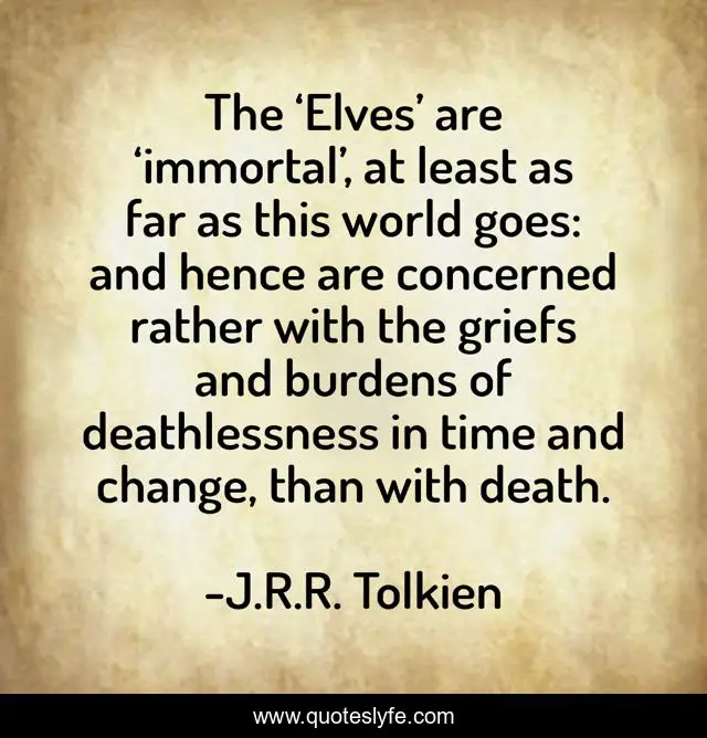 This page presents the quote "The ‘Elves’ are ‘immortal’, at least as far as this world goes: and hence are concerned rather with the griefs and burdens of deathlessness in time and change, than with death.". Author of this quote is J.R.R. Tolkien. This quote is about immortality, death, elves,.