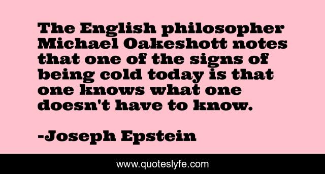 This page presents the quote "The English philosopher Michael Oakeshott notes that one of the signs of being cold today is that one knows what one doesn't have to know.". Author of this quote is Joseph Epstein. This quote is about focus, curiosity, discernment,.