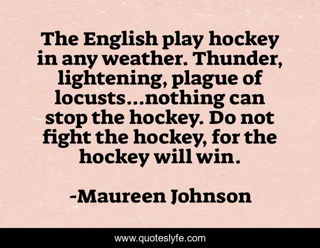 This page presents the quote "The English play hockey in any weather. Thunder, lightening, plague of locusts...nothing can stop the hockey. Do not fight the hockey, for the hockey will win.". Author of this quote is Maureen Johnson. This quote is about england, humor, hockey, rain,.