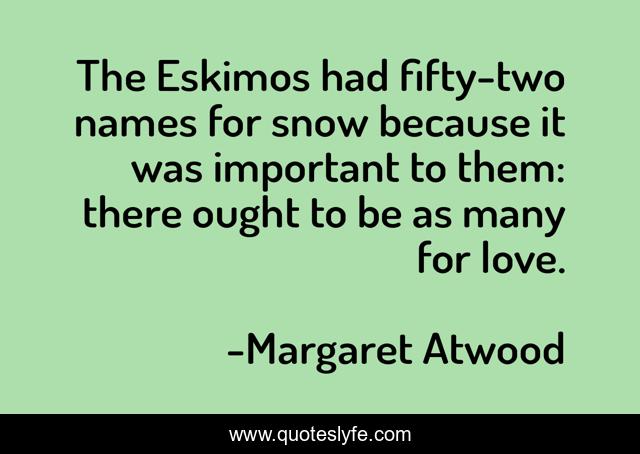 This page presents the quote "The Eskimos had fifty-two names for snow because it was important to them: there ought to be as many for love.". Author of this quote is Margaret Atwood. This quote is about important, love, snow, affection,.