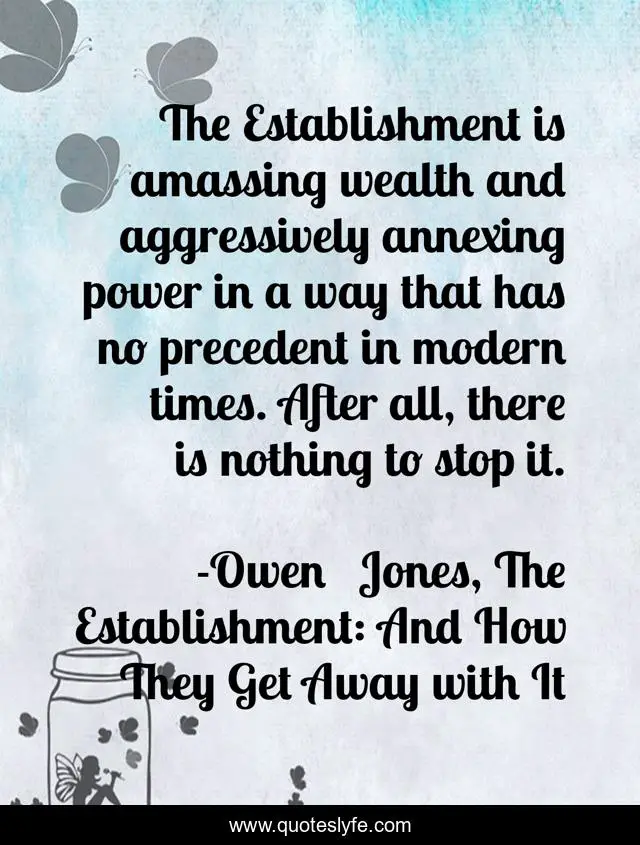 This page presents the quote "The Establishment is amassing wealth and aggressively annexing power in a way that has no precedent in modern times. After all, there is nothing to stop it.". Author of this quote is Owen Jones, The Establishment: And How They Get Away with It. This quote is about power, oligarchy, corporate-greed, corporate-culture, politics, the-establishment,.