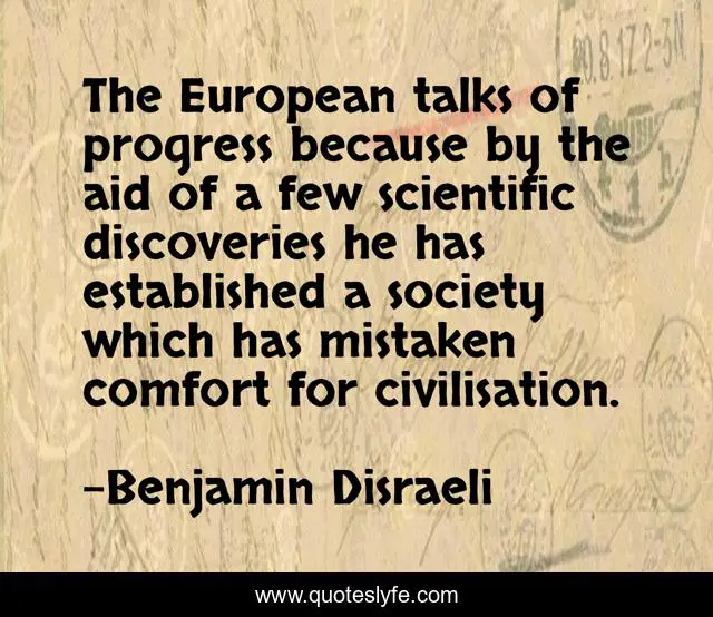 This page presents the quote "The European talks of progress because by the aid of a few scientific discoveries he has established a society which has mistaken comfort for civilisation.". Author of this quote is Benjamin Disraeli. This quote is about science, materialism, comfort, civilisation, progress,.