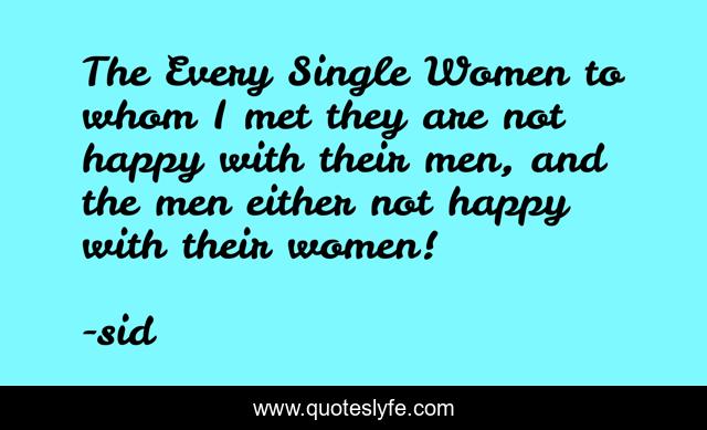 This page presents the quote "The Every Single Women to whom I met they are not happy with their men, and the men either not happy with their women!". Author of this quote is sid. This quote is about relationships, men, experience-inspiration, women-and-men, fact, women,.