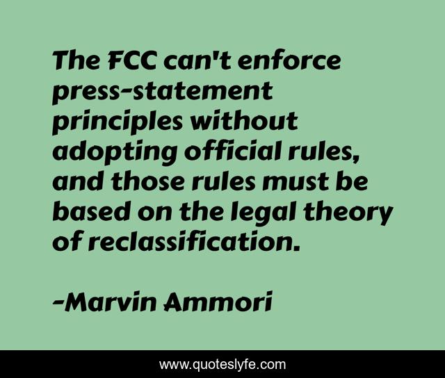 This page presents the quote "The FCC can't enforce press-statement principles without adopting official rules, and those rules must be based on the legal theory of reclassification.". Author of this quote is Marvin Ammori. This quote is about rules, without, principles,.
