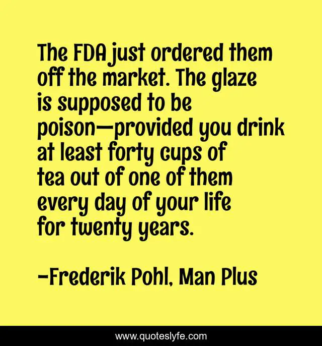 This page presents the quote "The FDA just ordered them off the market. The glaze is supposed to be poison—provided you drink at least forty cups of tea out of one of them every day of your life for twenty years.". Author of this quote is Frederik Pohl, Man Plus. This quote is about paternalism, safety,.