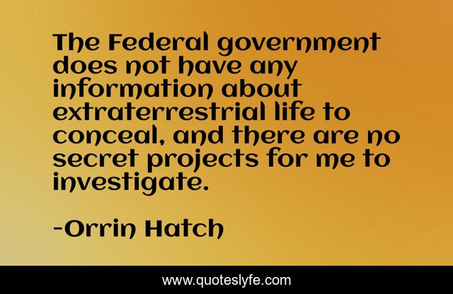 This page presents the quote "The Federal government does not have any information about extraterrestrial life to conceal, and there are no secret projects for me to investigate.". Author of this quote is Orrin Hatch. This quote is about me, information, life,.