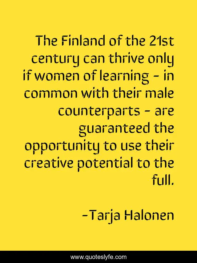 This page presents the quote "The Finland of the 21st century can thrive only if women of learning - in common with their male counterparts - are guaranteed the opportunity to use their creative potential to the full.". Author of this quote is Tarja Halonen. This quote is about women, opportunity, creative,.