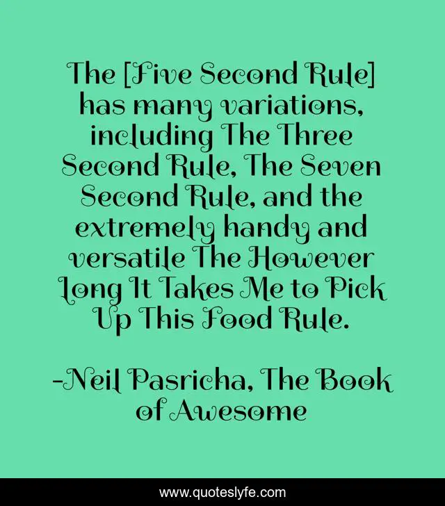 This page presents the quote "The [Five Second Rule] has many variations, including The Three Second Rule, The Seven Second Rule, and the extremely handy and versatile The However Long It Takes Me to Pick Up This Food Rule.". Author of this quote is Neil Pasricha, The Book of Awesome. This quote is about funny, food, 5-second-rule, dirty, germs, comedy,.