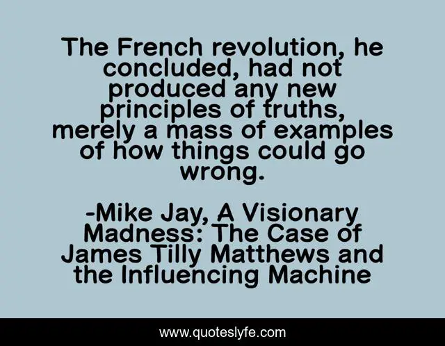 This page presents the quote "The French revolution, he concluded, had not produced any new principles of truths, merely a mass of examples of how things could go wrong.". Author of this quote is Mike Jay, A Visionary Madness: The Case of James Tilly Matthews and the Influencing Machine. This quote is about psychology, biography, history,.