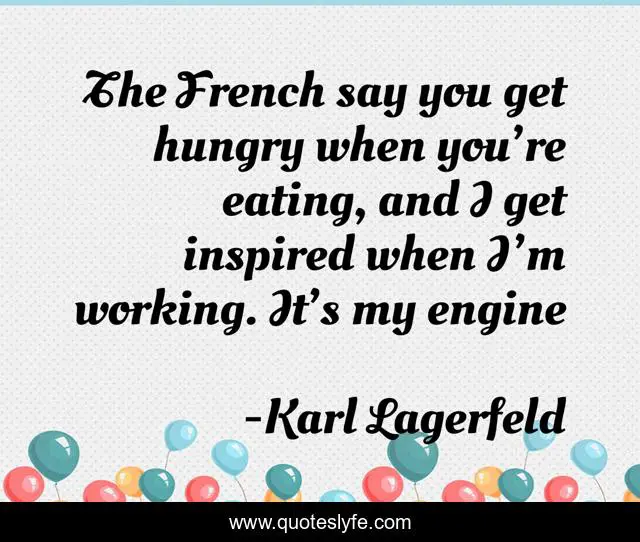 This page presents the quote "The French say you get hungry when you’re eating, and I get inspired when I’m working. It’s my engine". Author of this quote is Karl Lagerfeld. This quote is about fashion, art, success, create, work, hungry, french, designer, inspirational,.
