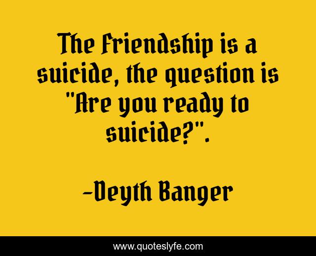 This page presents the quote "The Friendship is a suicide, the question is "Are you ready to suicide?".". Author of this quote is Deyth Banger. This quote is about the-question, suicide, friendship,.