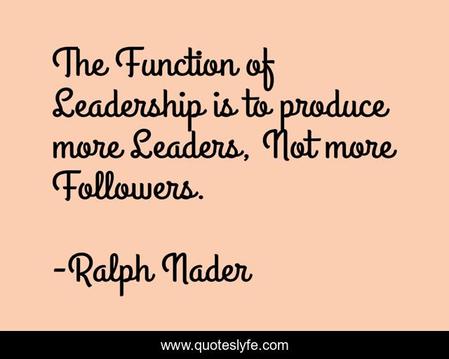This page presents the quote "The Function of Leadership is to produce more Leaders, Not more Followers.". Author of this quote is Ralph Nader. This quote is about quotes, leadership-development, personal-growth,.