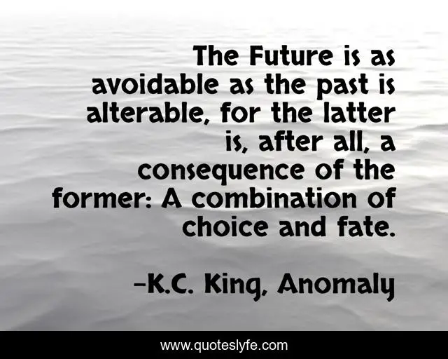 This page presents the quote "The Future is as avoidable as the past is alterable, for the latter is, after all, a consequence of the former: A combination of choice and fate.". Author of this quote is K.C. King, Anomaly. This quote is about past, future, fate,.
