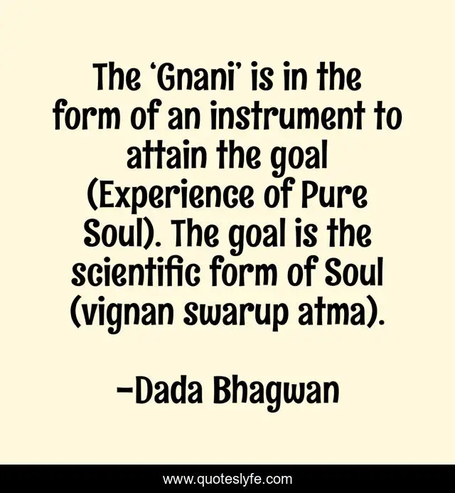 This page presents the quote "The ‘Gnani’ is in the form of an instrument to attain the goal (Experience of Pure Soul). The goal is the scientific form of Soul (vignan swarup atma).". Author of this quote is Dada Bhagwan. This quote is about spiritual, scientific, science, self, soul, experience, gnani, atma,.