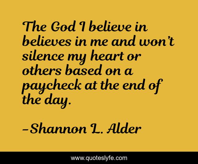 This page presents the quote "The God I believe in believes in me and won’t silence my heart or others based on a paycheck at the end of the day.". Author of this quote is Shannon L. Alder. This quote is about confidence, greed, hope,.