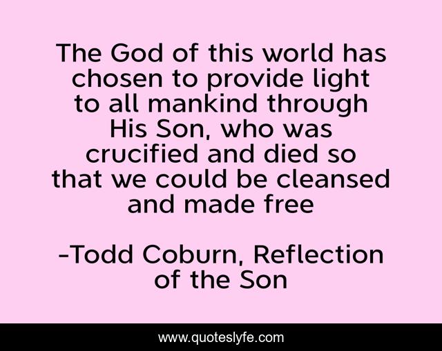 This page presents the quote "The God of this world has chosen to provide light to all mankind through His Son, who was crucified and died so that we could be cleansed and made free". Author of this quote is Todd Coburn, Reflection of the Son. This quote is about love, freedom, jesus, god, salvation, affection,.