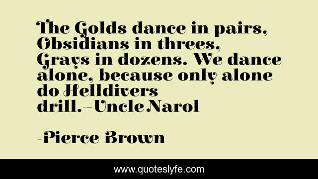 This page presents the quote "The Golds dance in pairs, Obsidians in threes, Grays in dozens. We dance alone, because only alone do Helldivers drill.~Uncle Narol". Author of this quote is Pierce Brown. .