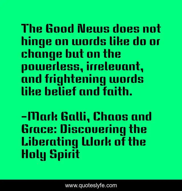 This page presents the quote "The Good News does not hinge on words like do or change but on the powerless, irrelevant, and frightening words like belief and faith.". Author of this quote is Mark Galli, Chaos and Grace: Discovering the Liberating Work of the Holy Spirit. This quote is about faith, gospel, works,.