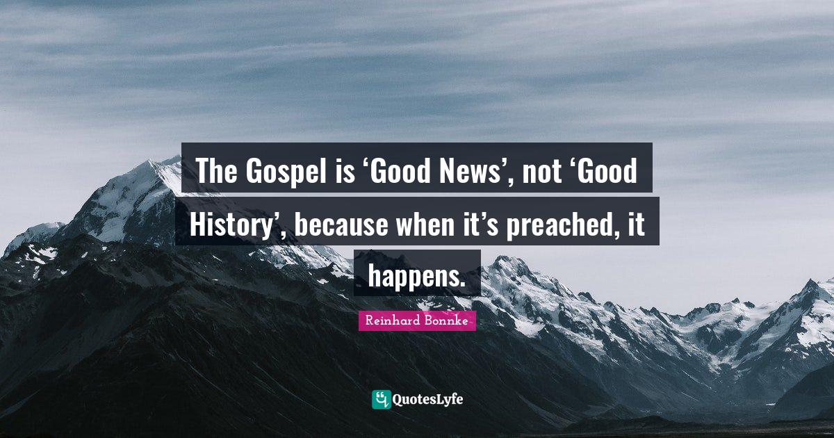 This page presents the quote "The Gospel is ‘Good News’, not ‘Good History’, because when it’s preached, it happens.". Author of this quote is Reinhard Bonnke. This quote is about happens, good news, good history, news,.