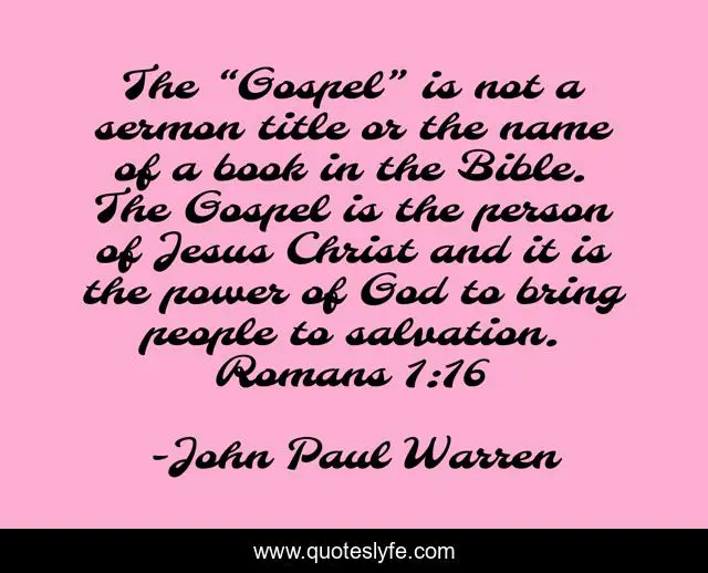 This page presents the quote "The “Gospel” is not a sermon title or the name of a book in the Bible. The Gospel is the person of Jesus Christ and it is the power of God to bring people to salvation. Romans 1:16". Author of this quote is John Paul Warren. This quote is about gospel, west-palm-beach, grace,.