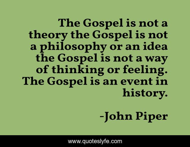 This page presents the quote "The Gospel is not a theory the Gospel is not a philosophy or an idea the Gospel is not a way of thinking or feeling. The Gospel is an event in history.". Author of this quote is John Piper. This quote is about thinking, philosophy, idea,.