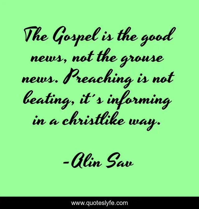 This page presents the quote "The Gospel is the good news, not the grouse news. Preaching is not beating, it´s informing in a christlike way.". Author of this quote is Alin Sav. This quote is about spirituality, leadership, church,.