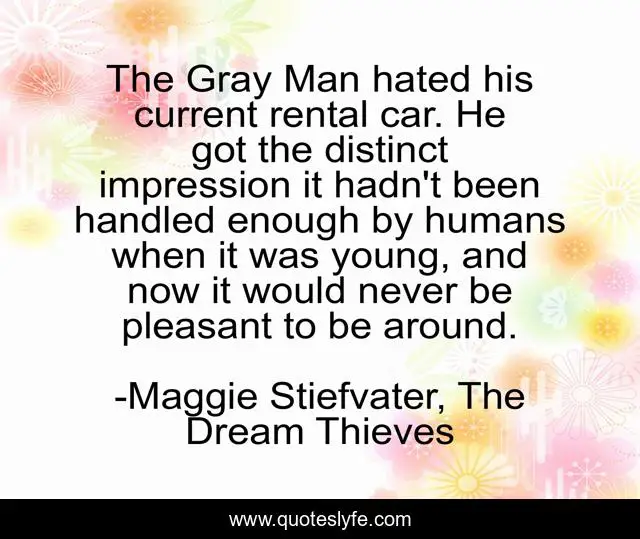 This page presents the quote "The Gray Man hated his current rental car. He got the distinct impression it hadn't been handled enough by humans when it was young, and now it would never be pleasant to be around.". Author of this quote is Maggie Stiefvater, The Dream Thieves. This quote is about car, gray, rental-car, children,.