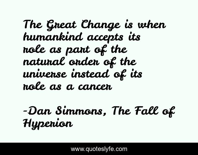 This page presents the quote "The Great Change is when humankind accepts its role as part of the natural order of the universe instead of its role as a cancer". Author of this quote is Dan Simmons, The Fall of Hyperion. This quote is about natural-order, humankind, cancer,.