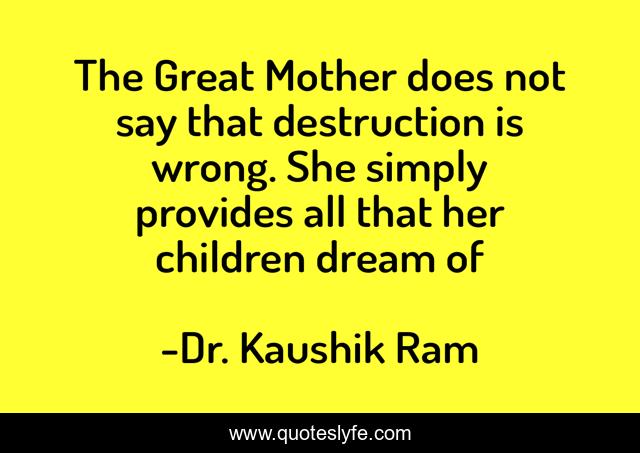 This page presents the quote "The Great Mother does not say that destruction is wrong. She simply provides all that her children dream of". Author of this quote is Dr. Kaushik Ram. This quote is about enthusiasm, inspirational,.
