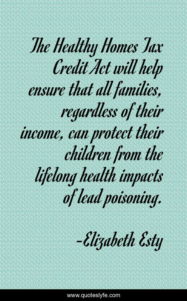 This page presents the quote "The Healthy Homes Tax Credit Act will help ensure that all families, regardless of their income, can protect their children from the lifelong health impacts of lead poisoning.". Author of this quote is Elizabeth Esty. This quote is about healthy, children, help,.